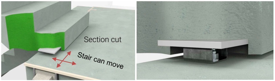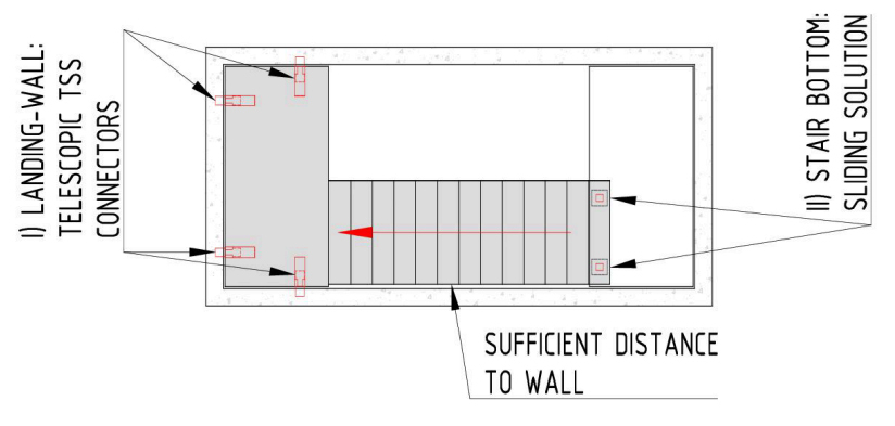 To deal with the interstorey drift, iC has chosen a solution where all stairs are free to slide at the bottom. With this premiss as a governing design principle, The Norwegian company Dr.techn. Olav Olsen was engaged to investigate the suitability of the TSS Connections in earthquake areas /3/. The study can be summarized in three main parts: