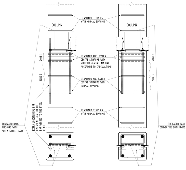 ![]() | The figure illustrates the recommended principal reinforcement localy to the column unit. A portion of the vertical force will spread into the column thru the reinforcement bar welded to the bottom of the steel plate, while the remaining force will go into the column thru distributed concrete stress underneath the steel plate. Splitting forces will occur due to horizontal spreading of the forces into the cross section of the column. The amount of reinforcement in Zone 1 can be calculated in accordance with Memo 521. An example of the |