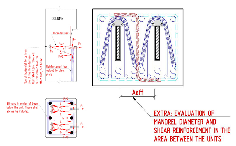 ![]() | The amount of reinforcement and final shape in several of the bars must be determined in each case. This can be done accordance to procedures given in Memo. Concrete Quality C35 and beam dimension: W × H = 300 × 450 is used in the example. This beam dimension corresponds approximately to minimum beam cross-section in order to exploit the unit’s capacity. For more information see memo 522a-e. |