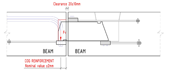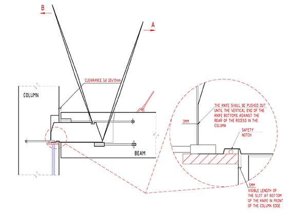 When deployed, the sliding knife cantilevers from the beam into the column. It bears onto the base of the column box at the free end, which induces rotation of the knife. This is resisted by bearing against half-round bearing blocks in the beam (see below). These half-round blocks in turn bear against reinforcement which is not shown in the diagram, but is dealt with later in the guide.